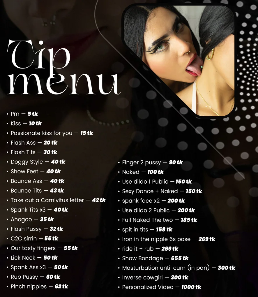 De quatro, Ahegao, Dança erótica, Tapas, Beijo, Avaliação de pintos, Striptease, De boca na boceta, Boquete, Massagem, Masturbação, Peitinhos, Show com óleo, Topless, Rebolando, Orgasmo, Punheta, Capô de fusca, Penetração com dedos, Dildo ou vibrador, Fetiche por pés, Garganta profunda, Mandar bater uma, Gagging, Brinquedos para mamilos, Hardcore, Posição 69, Cavalgada, Beijo grego, Brinquedos sexuais, Ejaculação feminina, Salto alto
