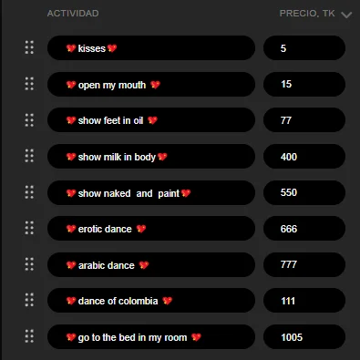 Tapas, Dança erótica, Brinquedos sexuais, Punheta, Penetração com dedos, Látex, Atuação, Nylon, Salto alto, Couro, Anais, Masturbação, Gagging, Show com óleo, De quatro, Striptease, Dildo ou vibrador, Garganta profunda, Boquete, Cavalgada, Rebolando, Gozada